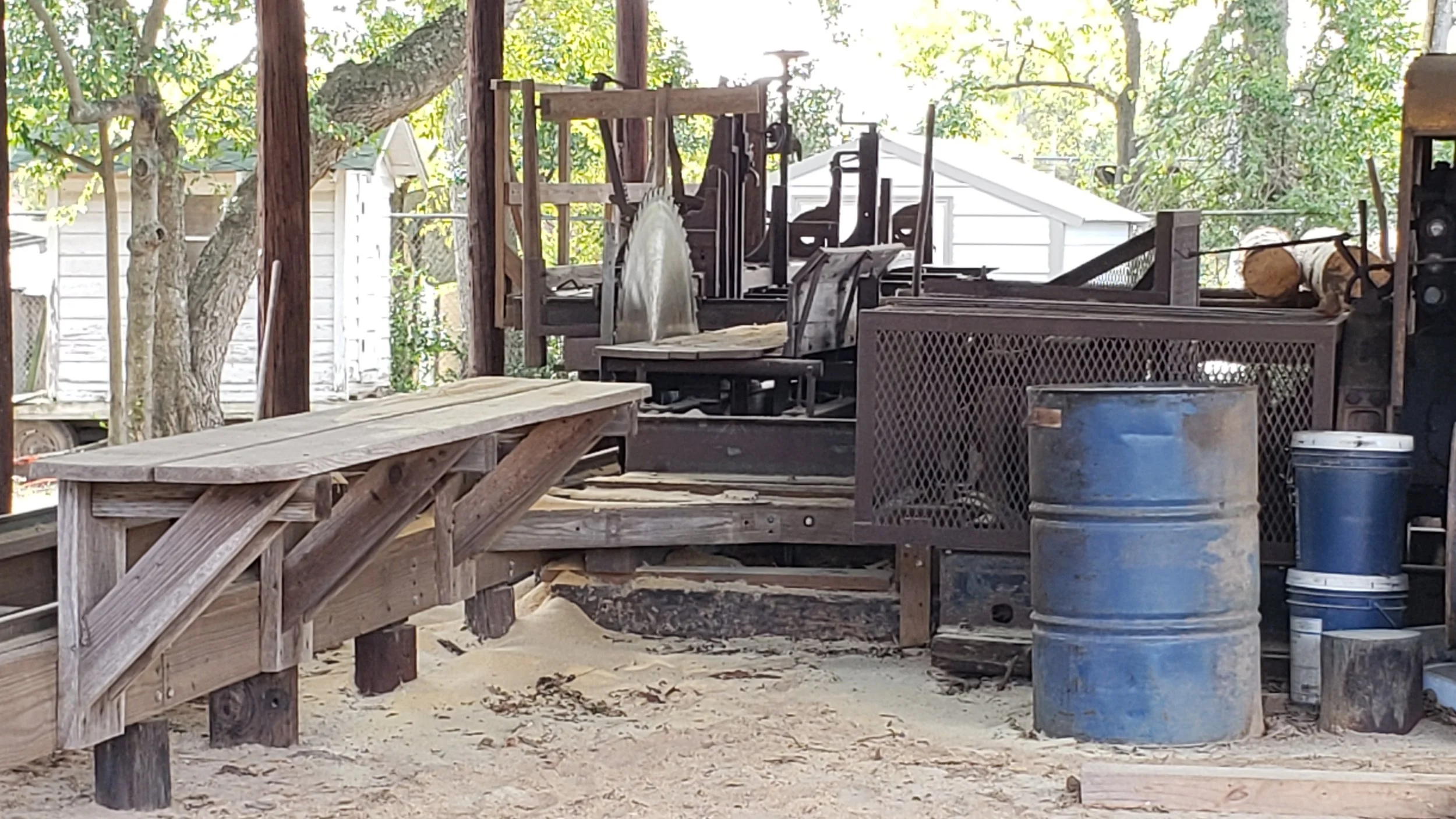 The saw mill was found on eBay by a member of a Rusk County saw mill family. He contacted Hudson Timber Products, who was running the ad and asked if they would consider making a donation to the Depot Museum. They said yes, and the 1930's style round saw blade mill was shipped from Barneveld, New York in 2003. The saw mill was installed by the East Texas Antique Tractor Assn. under Alton Jones. It sawed its first logs at the 2004 Heritage Syrup Festival.